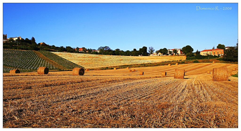 La composizione è ottima e la luce quel giorno doveva essere fantastica,ma la saturazione usata sembra in eccesso,soprattutto il cielo ha tinte non naturali,così come il fieno e le case.