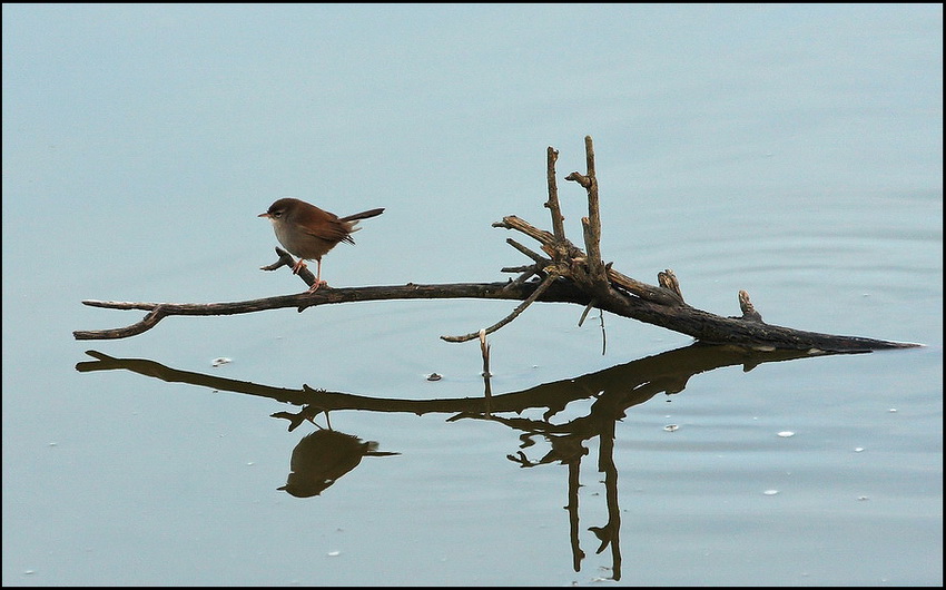 L'effetto del riflesso e l'esposizione che rende il ramo ed il passerotto quasi in silhouette rendono l'immagine delicata ed originale.