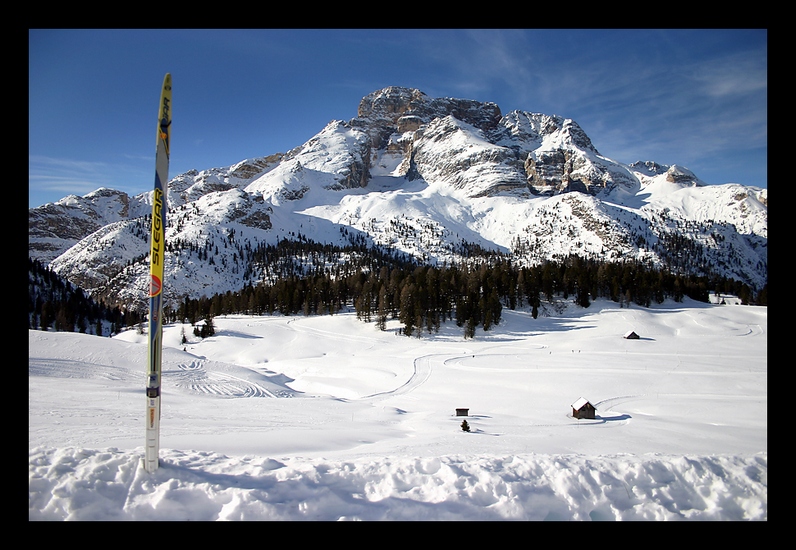 lo scatto è piacevole...molto solare, ottima nitidezza sullo sfondo, ottima esposzione...gli sci....non so è vero che danno profondità e chiudono l'immagine ....sbanalizzano pure un po' un classico scatto di montagna...però bo...non mi convincono del tutto...forse perchè sono un po' fuori fuoco...magari con 2-3 paia di sci affiancati avrebbero dato più forza e più profondità...