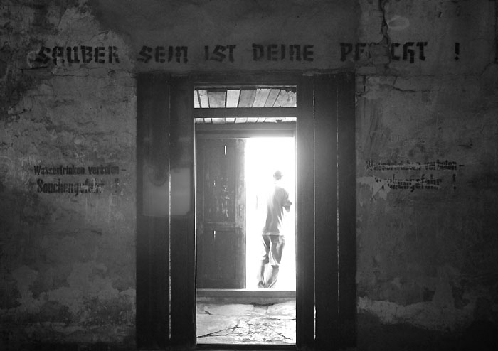 Un'immagine triste che rappresenta in maniera originale il dramma dei lager nazisti. Sarebbe bello capire il significato della frase, ma comunque l'obiettivo é stato raggiunto: farci riflettere.