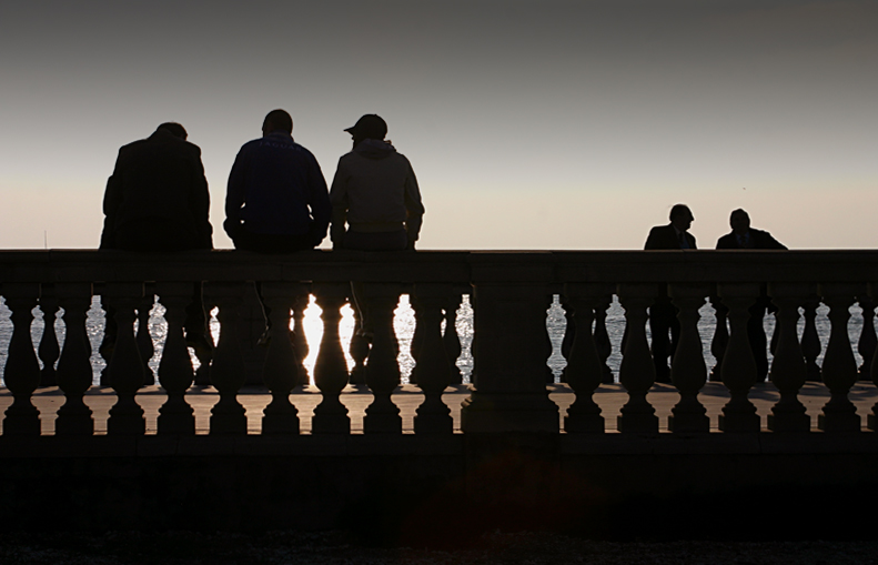 questa foto mi piace sopratutto per la compostezza e il senso di ordinato equilibrio che riesce a restituire le silhouette dei soggetti, anche se chiacchierano la trovo molto silenziosa, quiete.