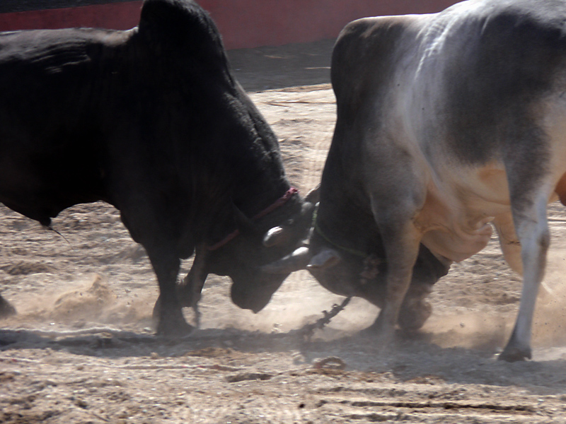 Grosso modo il "combattimento" è una prova di forza, si spingono con la testa e a volte quasi ribaltano l'avversario.... anche perché essendo trattenuti da una corda si sgambettano da soli....