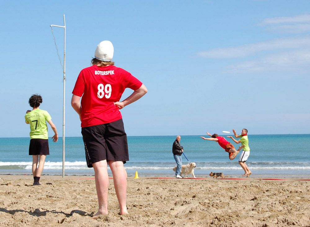per un gioco di prospettiva sembra che il ragazzo in tuffo stia planando sul cagnolino
