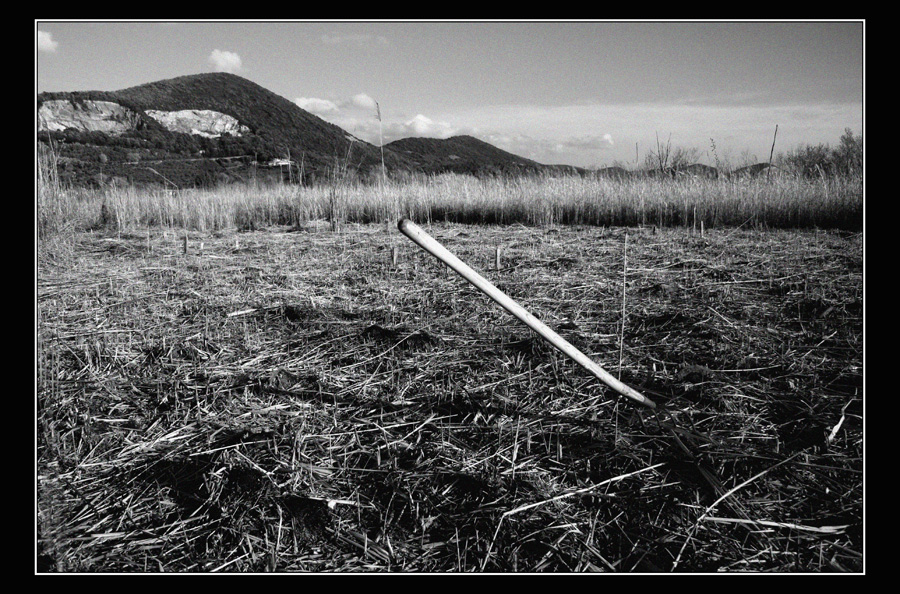 la trovo cominucativa e diretta. il manico dell attrezzo sembra quasi uscire dallo schermo. il b/n ci sta ottimamente e il taglio mi piace, con il grano ancora da tagliare che ricorda il lavoro da finire.