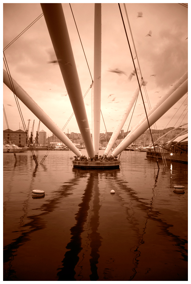 Il mare, la parte bassa, l'acqua, con il suo gradiente che tende allo scuro, in basso, carica l'immagine di una particolare atmosfera, che esalta la struttura del porto, e la rende ancora più immobile, ben giocando sul movimento dei gabbiani nelle sue vicinanze..