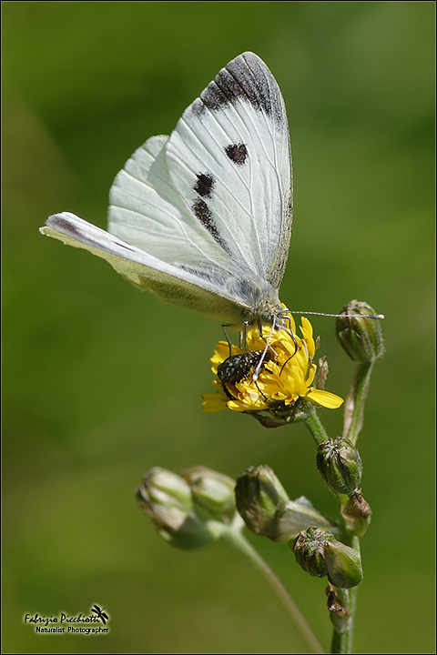 la farfalla, in una posizione dominante rispetto all'altro insetto, sembra lo voglia catturare all'interno del fiore.