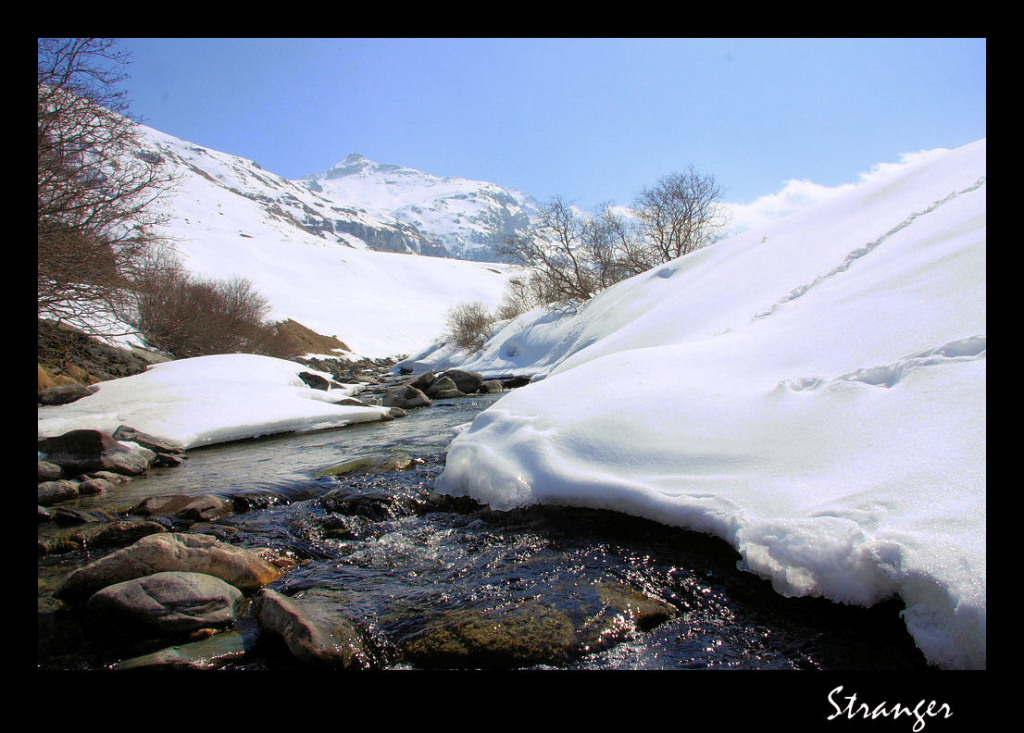 In una immensa vallata sommersa di neve tenta di emergere un piccolo ruscello che lascia immaginare l'acqua gelida.