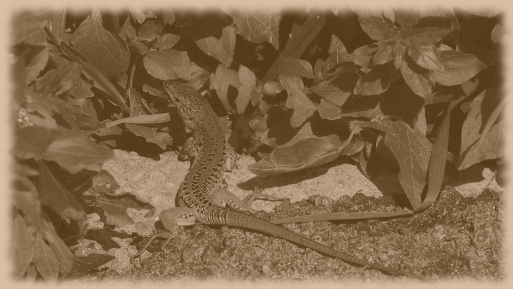 lucertola in fuga mi è piaciuta lidea della foto in bianco e nero seppia con cornice sfumata