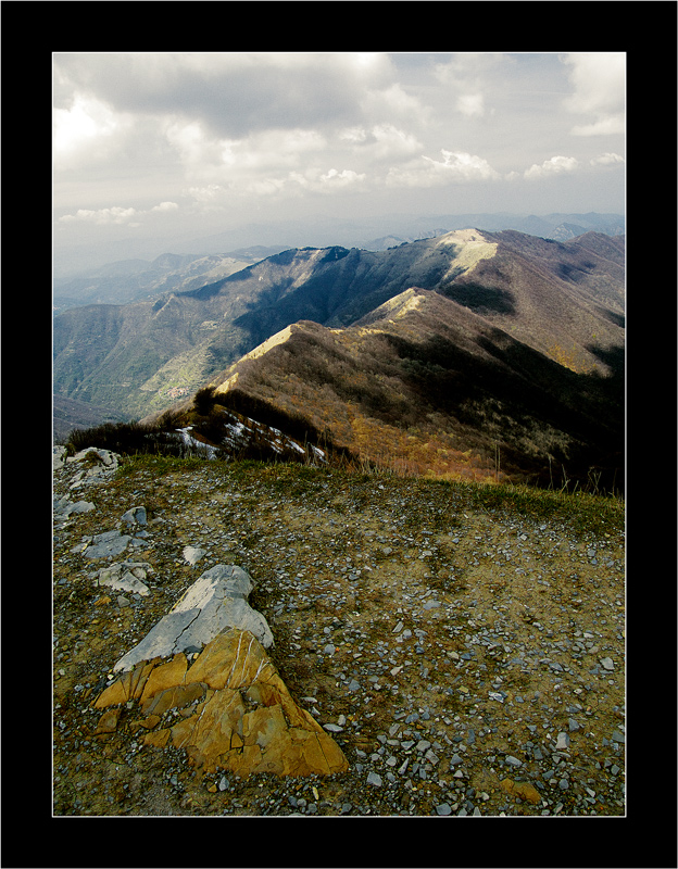 ma che bella questa cresta che parte dall'orizzonte, si snoda per tutta l'immagine e si conclude, con una linea immaginaria seguendo i sassi, sul profilo delle pietre in primo piano, a formare un grande punto interrogativo.