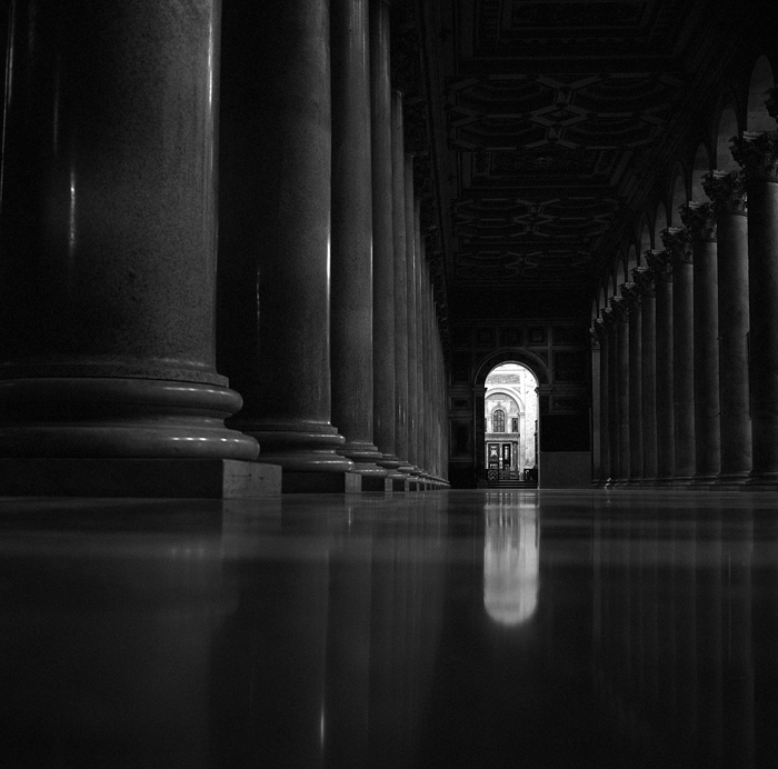 | Avrei optato per un'inquadratura leggermente più in alto, dando così spazio al pavimento giusto quanto bastava per far leggere in riflesso il portale, o poco più. Interessante il b/n, ben fatto. Forse il grandangolare, maggiormente ai bordi, ha distorto le verticali, ma nell'insieme, e percorrendo le colonne verso la parte più chiara, si nota meno. |