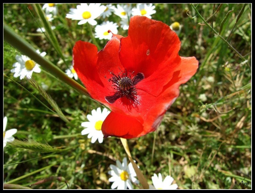 Il papavero sembra appena sbocciato ma già stanco di vivere, visto alcuni acciacchi che ha, i suoi petali non sono perfetti e quindi mi era sembrato che le margheritine intorno stessero li per fargli forza e compagnia.