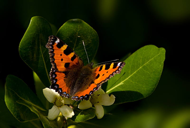 Mi piacciono i colori. Buoni compo e maf. La vedo leggermente sottoesposta, ma facilmente recuperabile in post, per esempio, con curve di PhotoShop, spostando (in curve) il cursore dall'angolo in alto a dx orizzontalmente lungo il bordo verso sx (la distanza decidila tu). Visto che è la prima farfalla direi che inizi molto bene. Ok! Ok!
