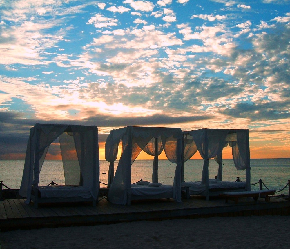 Mi piace il colore del cielo in alto e il fatto che la tonalità arancione si vede soltanto vicino ai baldacchini dei letti, come se fosse un'illuminazione dedicata solo a quelli che ci si sdraieranno.