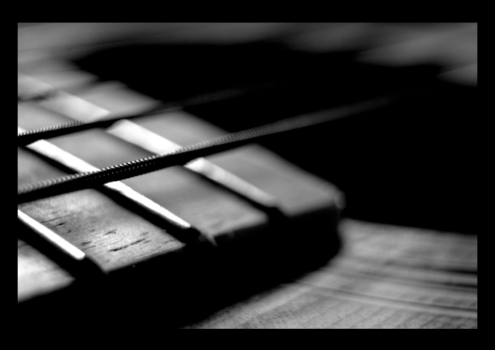 Non male come idea però non mi convince molto la gestione della luce e la conversione in B/N: vedo qualche bruciatura sui tasti (limitandole in estensione potrebbero anche starci), un grigio abbastanza uniforme e poi il nero, secondo me ci sarebbe stata meglio una luce in grado di modellare le geometrie della chitarra.
