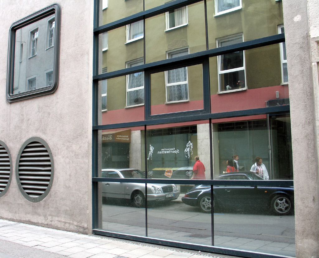 Allora KATIA...la vita si sta svolgendo tutta nella strada ed è riflessa dalla superficie vetrata, che come se fosse una vetrina la mette in esposizione, mentre l' edificio è muto quasi senza vita, della quale ci si accorge quasi per caso e solo per uno spiraglio della finestra semiaperta con le tendine scostate...O NO ?