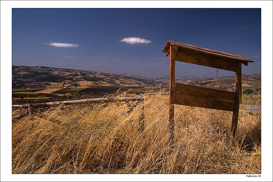 L'ordine delle colline, pettinate e colorate dalle coltivazioni di stagione e dalla relativa lontananza di visione, il disordine scarmigliato del primo piano, con il giallo delle spighe spettinato dal vento e la quasi irrealtà di un cielo immobile ed azzurro, solo punteggiato da due nuvolette da disegno infantile...