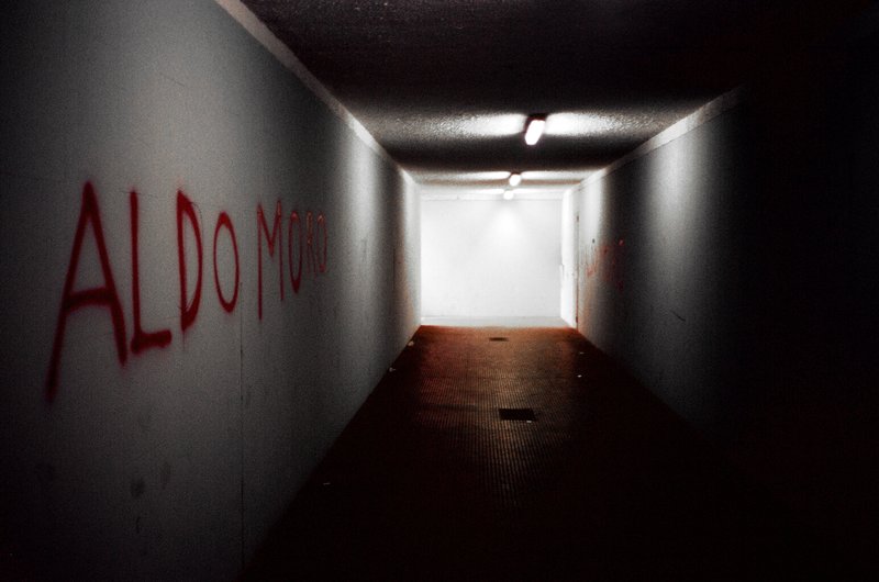 Un b/w molto marcato con solo la scritta "Aldo Moro" in rosso...in modo da evidenziare la tragicità che c'è dietro al quella scritta!