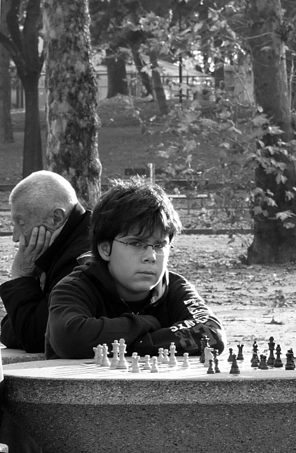 Due attese contrastanti, quella del ragazzo che ha già mosso e ti fissa, e quella del signore dietro(al quale avrei dato molto+ aria) che fanno muovere la foto appena un filo + in là di una semplice rappresentazione di una partita di scacchi...