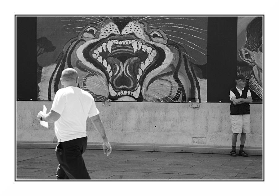 Molto interessante questa street: sembra che la persona in prima piano si sia voltata a considerare le fauci minacciose del murales.