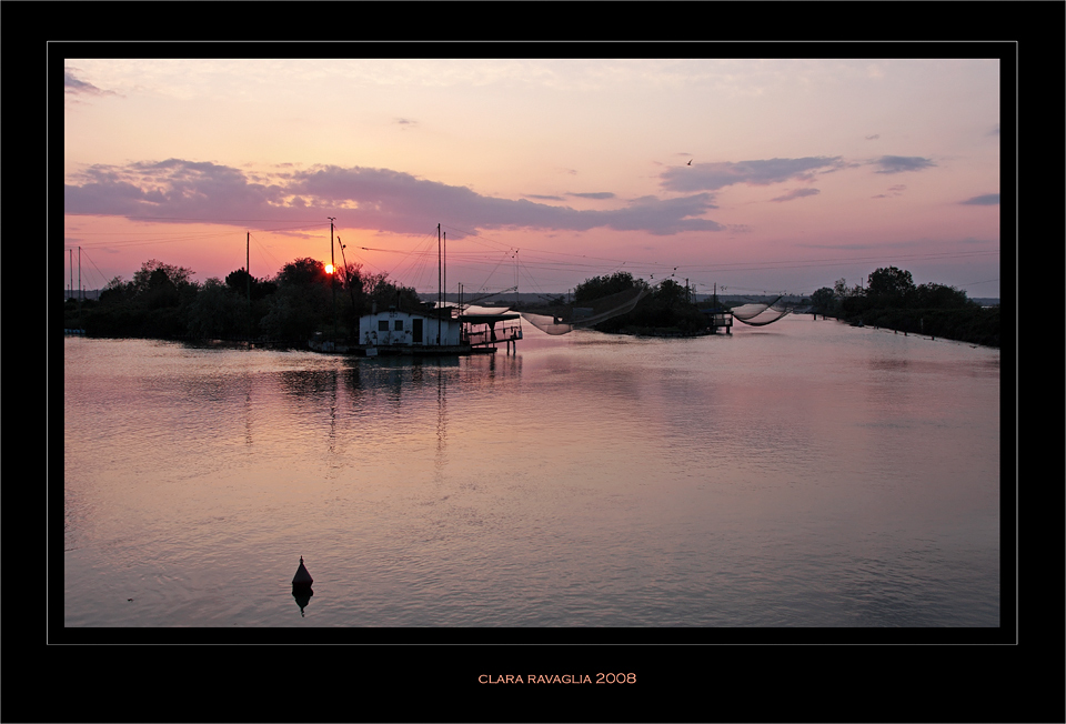 Già ...si sospende quest’atmosfera da respirarsi ad occhi ancora una volta socchiusi, come sospeso è l’orizzonte vicino che pare galleggiare senza peso sulla distesa dell’acqua cheta. Un orizzonte vicino, fatto di “cose”, di alberi, di reti, i canali, la casa, ...un orizzonte di cose “tangibili” che parlano di luoghi ma soprattutto di persone.