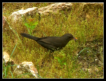 Da qui sembra proprio un merlo nero con becco giallo/arancio.