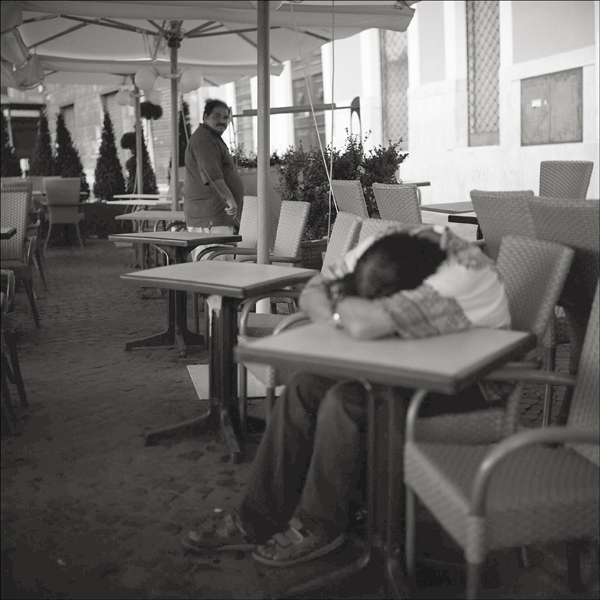 Perfetto lo sguardo dell'uomo dietro, mentre secondo me la pecca sta nella composizione "troppo" rigorosa: un uomo sfocato in primo piano meritava di stare ai margini, nei terzi invece gli hai dato forza, e allo stesso tempo l'hai sminuito con lo sfocato. Funziona, ma non funziona.