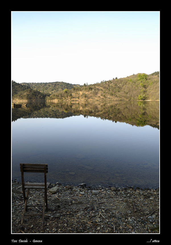ma in questa tua composizione c'è molto di +: c'è quella stasi, quella serentià del paesaggio di fronte, della terra pure lei sembra aspettare immergendosi nell'acqua;e terra, acqua,terra,cielo creano come un alternarsi di spazi vuoti, ke amplifica la mancanza di quel qualcosa o di quel qualcuno per cui si attende, circondati da nulla se nn da un silenzio..