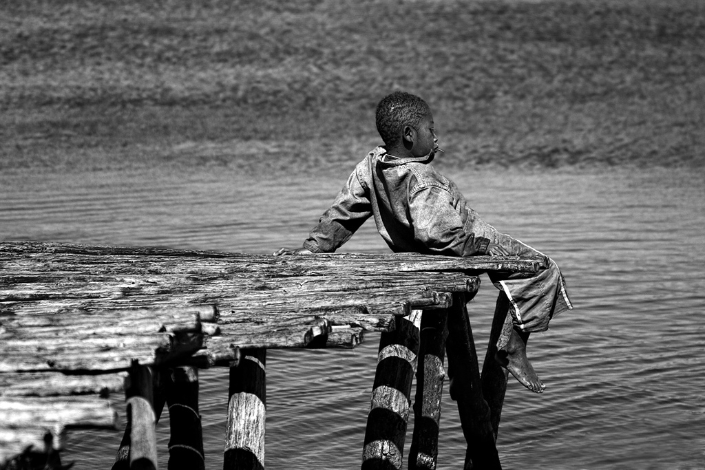 L'acqua, il molo in legno e il ragazzo hanno tutti la stessa densità media di grigio.