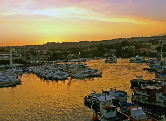 i fumi dell'etna in eruzione davano particolari colori al cielo e al porto sottostante..
