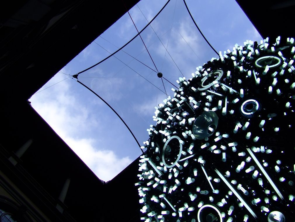 Detto questo, personalmente, avrei cercato di inquadrare questa struttura con tutte queste lampade a risparmio ma tenendo sullo sfondo una zona il pił scura possibile, oppure, per seguire la tua scelta, non tagliare in maniera cosģ brusca la zona di cielo che rimane visibile, nella parte alta, magari riuscendo a tenerlo in maniera pił ordinata al centro, visto che la parte bassa non aggiunge molto, essendo scura e non interessante con la presenza di quelle colonne..