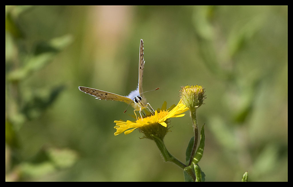 Il soggetto si disperde troppo nel fotogramma. Troppo centrale. Un taglio verticale o quadrato avrebbero valorizzato maggiormente la licenide. La macchia rosa in alto distrae da uno sfondo abbastanza omogeneo. Buona maf sul soggetto e posatoio. Un filino di maschera di contrasto in più.