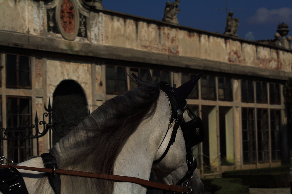 Qui della villa si vede solo un pezzo sullo sfondo sfuocato e la testa del cavallo un po' tagliata che poi non trovo particolarmente funzionale all'immagine.