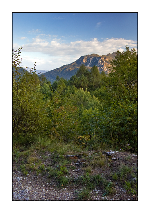 ...molto bella la luce che colpisce la montagna sullo sfondo.... la vegetazione tende a coprire in modo un po troppo presente la visuale verso i monti, punto dove lo sguardo viene indirizzato.... il primo piano er decisamente da eliminare...troppo vuoto e insignificante tende a distrarre senza motivo.....