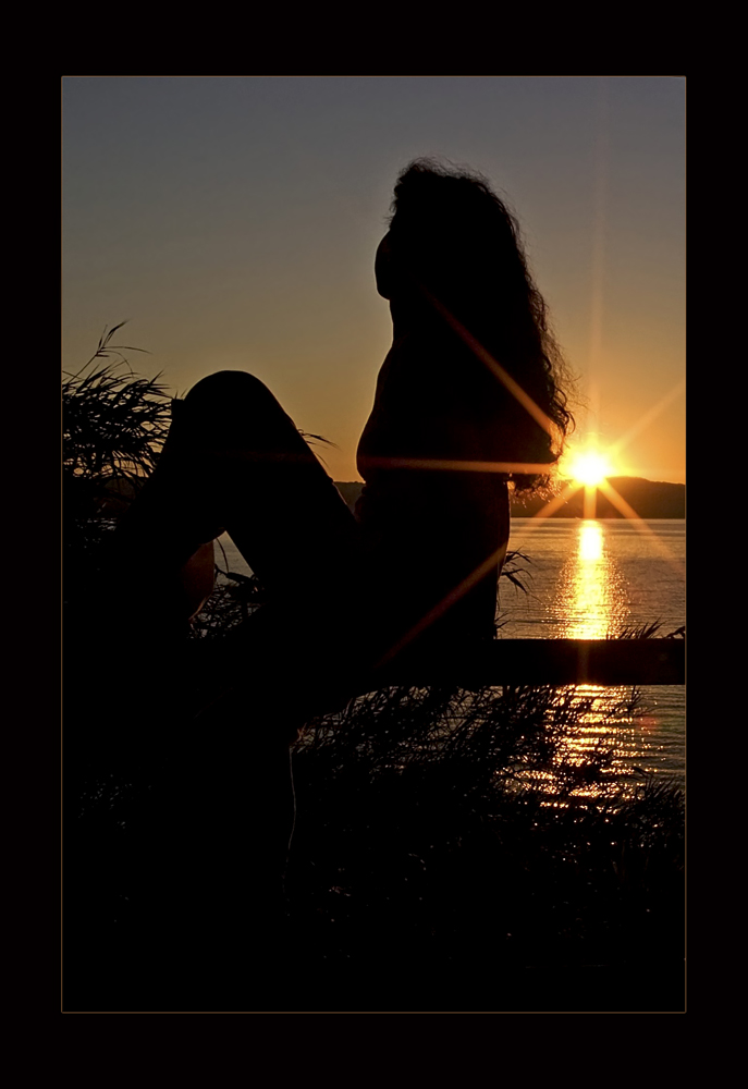 molto bella la silouette della ragazza con il sole "stellato" e i riflessi sul mare