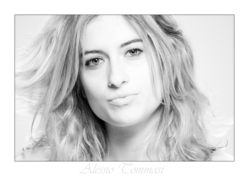 Forse nel processo di conversione in bianco nero ci si è spinti troppo in là con il canale del rosso e le labbra hanno finito con l’assumere un tono di grigio troppo chiaro rispetto all’incarnato, mentre proverei a lavorare selettivamente le alte luci sui capelli per enfatizzarne il disegno.