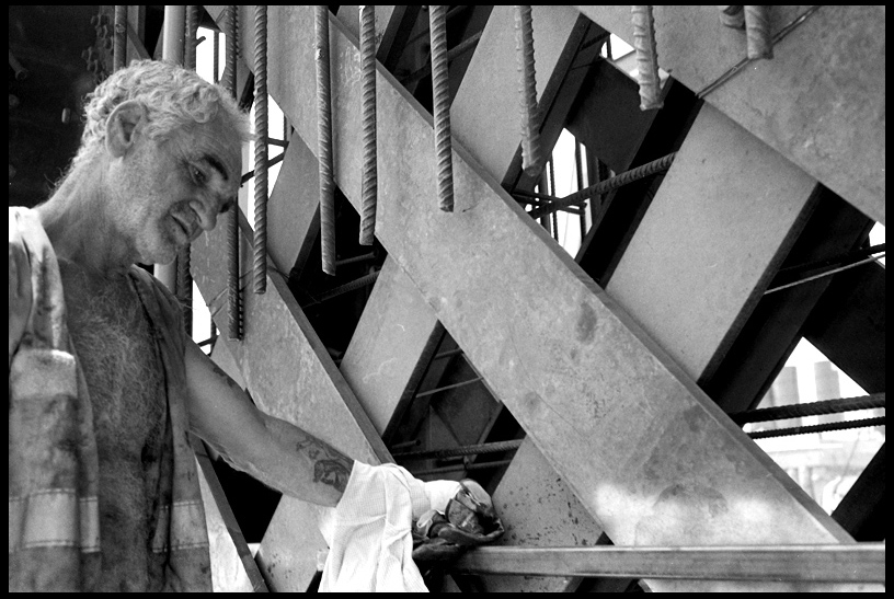 mi pieceva però l'espressione di stanchezza (purtroppo un po' sfocata)dopo una giornata di lavoro in questa specie di gabbia metallica (da me progettata Triste ) e sullo sfondo a destra ancora costruzioni "da cantiere", alla luce.