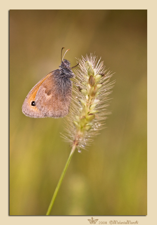 Le tonalità principali dello sfondo si ritrovano nelle dominanti della spiga, e su questa armonia di tinte il particolare punto di arancio e beige della farfalla spicca con forza e nettezza