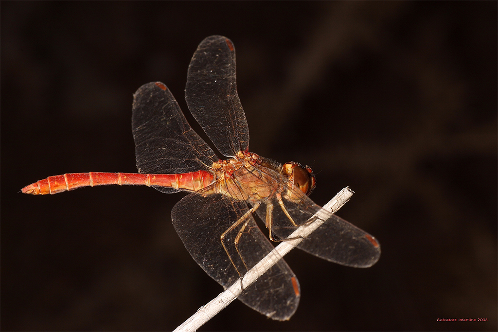 Ottimo scatto, caro Salva! I tuoi sfondi neri sono sempre doc, in questo caso poi valorizzano in pieno la libellula, evidenziandone i contorni e le ali! forse disturba leggermente il posatoio così chiaro, ma sono dettagli! Bravissimo come al solito, caro amico! Ok!