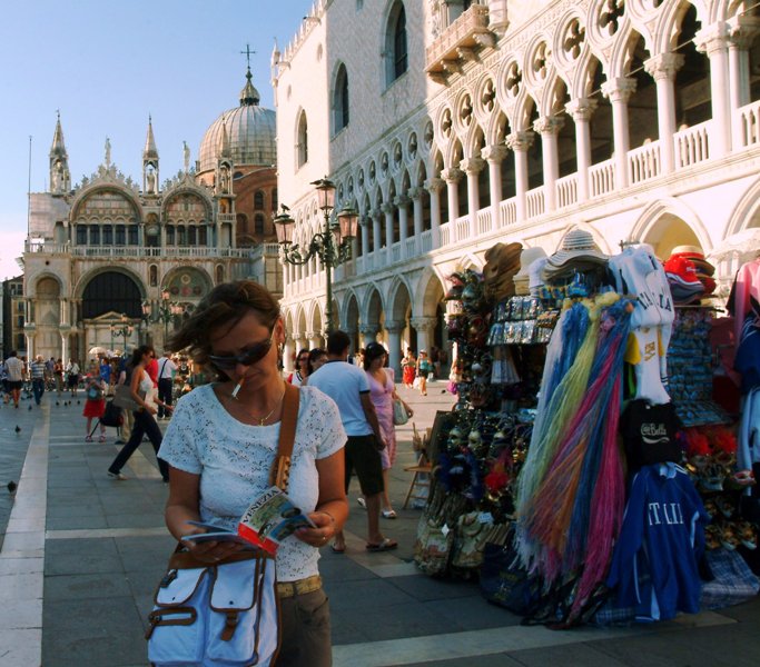 Questa funziona bene perché si vede il Palazzo Ducale, la Basilica di S. Marco e la scritta Venezia sulla guida (ci sarebbero poi anche le magliette con la scritta Italia).