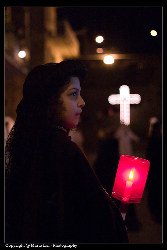 Molto bella soprattutto la composizione dell'immagine con i tre elementi principali (volto della ragazza, croce luminosa e candela) che riempiono gli spazi e sono equilibrati dalle luci che rischiarano il palazzo in alto a destra.