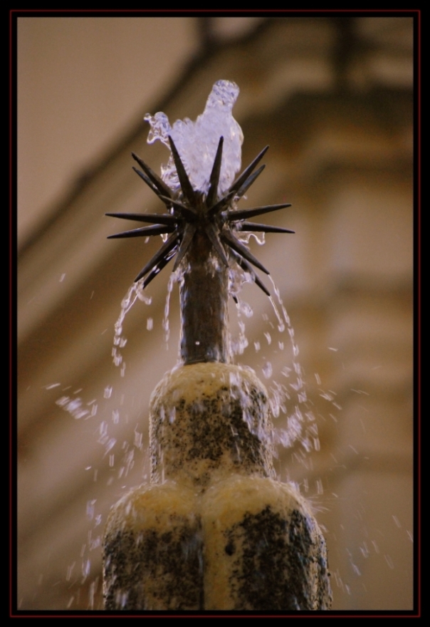 hai scelto di tenere il guizzo d'acqua e la parte di fontana praticamente al centro della scena per aumentarne l'effetto e il risultato in termini di attenzione.. ma la scelta è penalizzata un po' dalla mancanza di nitidezza davvero percettibile, forse data da un po' di mosso nato in fase di scatto.. scattato a mano libero in condizioni di poca luce? vedo dai dati di scatto che hai usato ISO 1600..