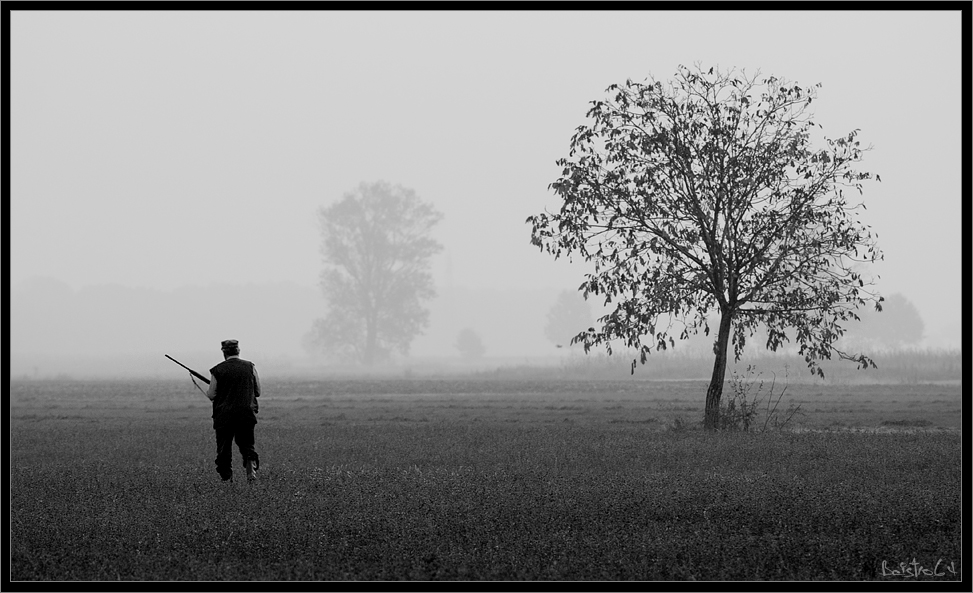 Trovo il cacciatore troppo definito nella nebbia, anche se è un elemento di equilibrio nell'immagine . Per mio gusto personale, lo porrei un pò più in lontananza. Forse perchè non sono molto simpatizzante per la caccia. Molto bello il paesaggio circostante realizzato nel tuo stile inconfondibile.