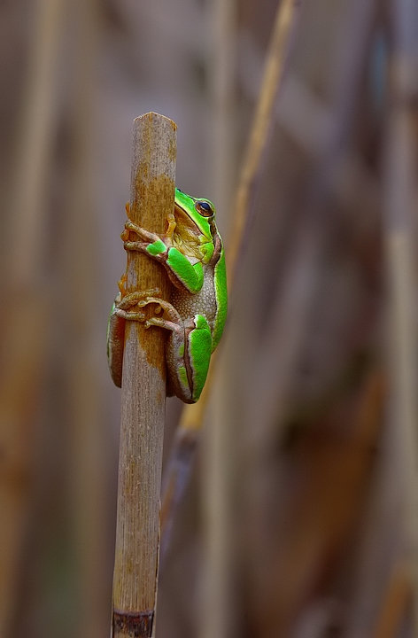 Canon MK III Canon 100 F/2.8 Tv 1/60 Av 5.6 Iso 400 Comp.Esp. -1 1/3 Mano libera, non potevo usare il treppiede vista la posizione in cui si trovava la raganella, canneti in riva ad un canale, unico appoggio il mio ginocchio....