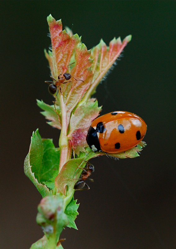 Buona macro, in cui perfettamente a fuoco vedo solo la coccinella, mentre la formica in basso è mimetizzata sullo sfondo, secondo me troppo uniforme
