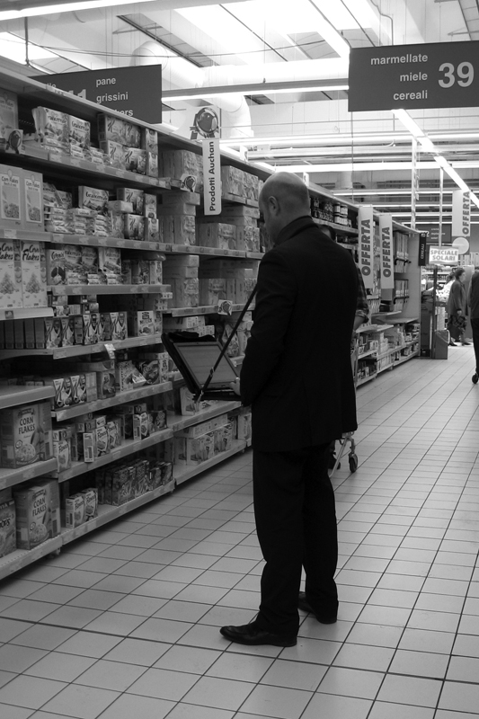 In senso assoluto vedere un omino con un notebook al collo in un supermercato può essere insolito e giustificare il click ... (per chi ha fatto l'agente di commercio non sarà così insolito) ...