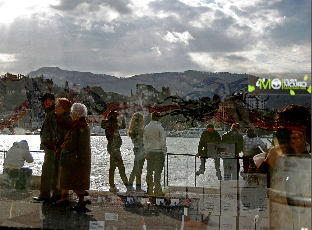 Molto bello l'effetto dei riflessi del porto sulla vetrina dell'enoteca.