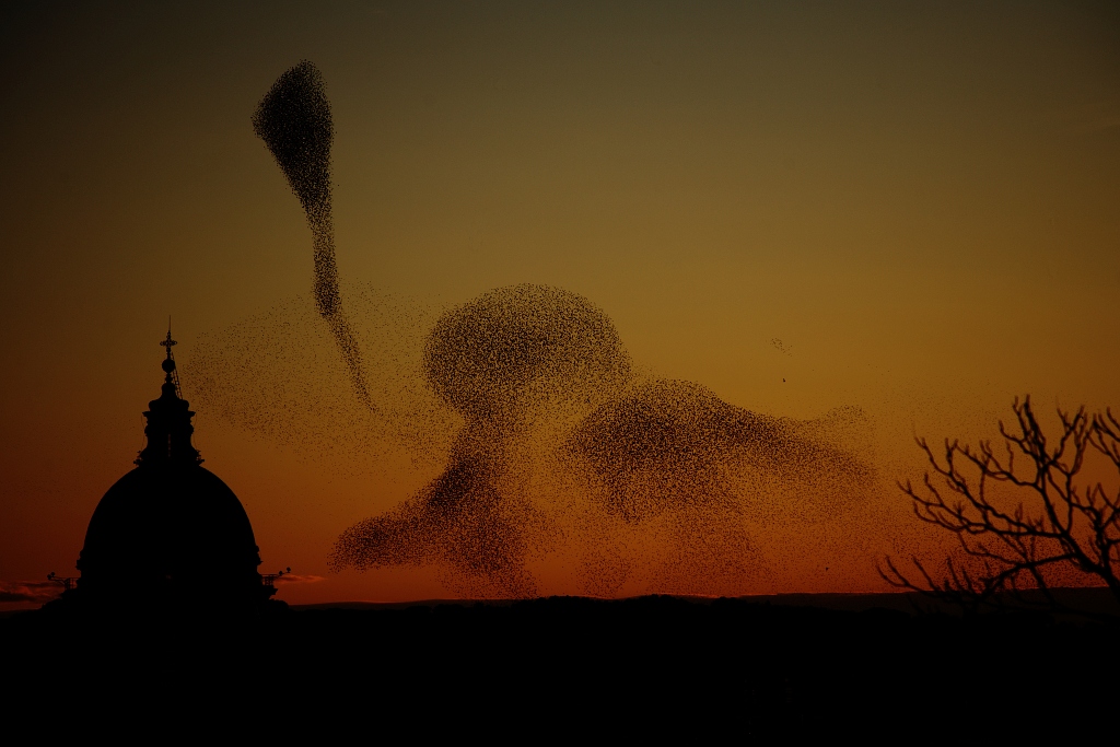 stormi di storni che formano una figura umana a braccia aperte. Molto bella l'immagine anche nel suo insieme. Complimenti