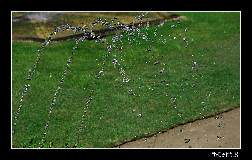 Gli zampilli sono carini, ma secondo me lo sfondo è troppo presente, avrei aperto tutto il diaframma e cercato (a volta non è possibile) di tenere fuori le parti fuori dal prato verde...