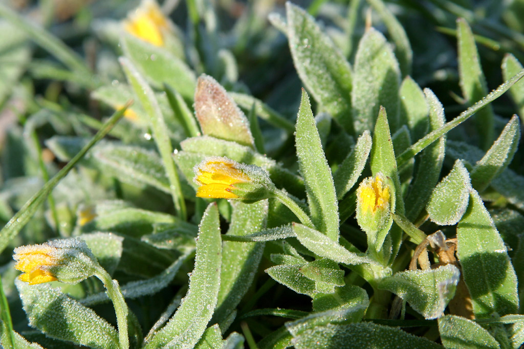 La troppa luce ti ha fatto perdere parecchio dettaglio. A mio avviso volendo enfatizzare la brina, avrei preso un solo fiore, mettendo in evidenza il soggetto come da titolo.
