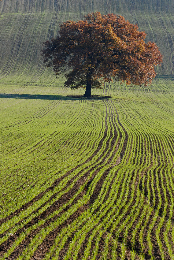Il verde tenero vira di tinta sotto l'effetto di una differente inclinazione della luce, sotto la benedizione del grande albero.